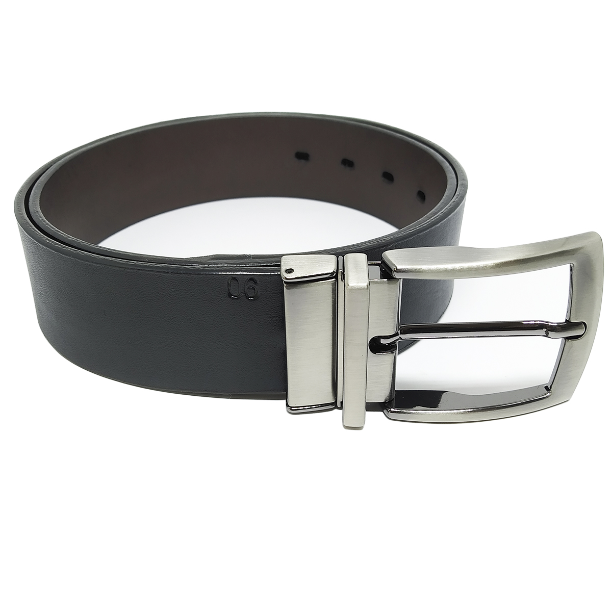 De um lado o cinto é na cor preto do outro marrom.